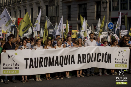 Arrangeret af dyreværnspartiet PACMA - som ved parlamentsvalget i juni næsten fik stemmer nok til at få et mandat i parlamentet – kom deltagerne fra hele landet for at vise deres modstand mod tyrefægtning.