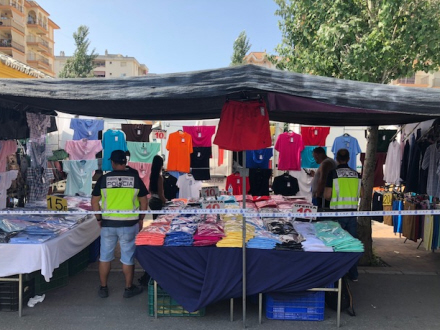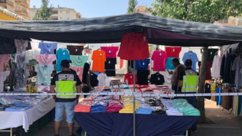 To store lastbiler blev proppet med piratvarer, efter politiet slog til mod tirsdagsmarkedet på feriapladsen i Fuengirola, Málaga.