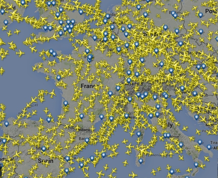 Luftrummet klokken 12:50. Det ses tydeligt, at trafikken over Frankrig er mindre intens end i den øvrige del af Mellemeuropa