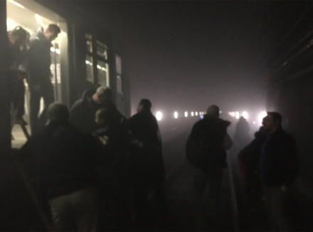 Folk forlader et tog nær Mallbeek kort efter eksplosionen