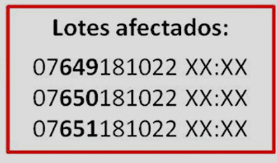 Den spanske lægemiddelstyrelse, La Agencia Española de Medicamentos y Productos Sanitarios, Aemps, advarer om, at partierne 07649, 07650 og 07651 ikke bør anvendes, da man har konstateret tilstedeværelsen af en bakterie, der kan forårsage infektioner.