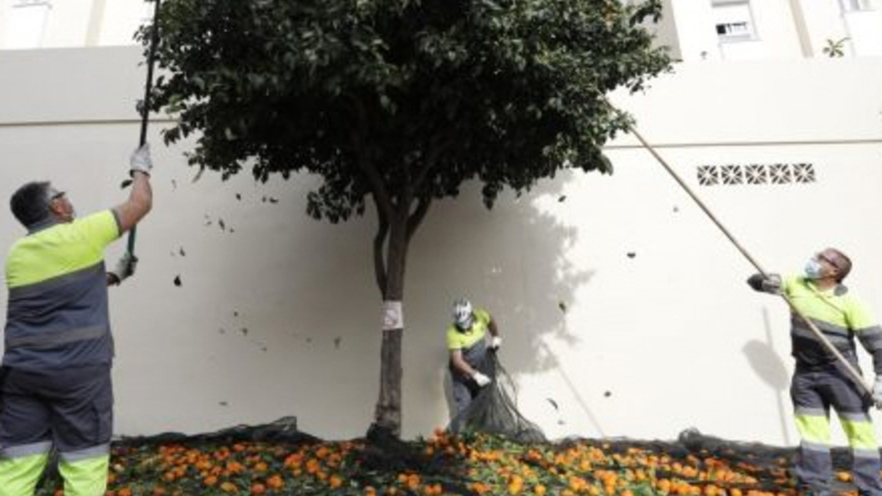 Torremolinos har i alt 550 træer, og frugten fjernes ved hjælp af ryste-metoden, der får appelsinerne til at løsne sig og falde ned på et stort net, der er lagt ud på jorden.