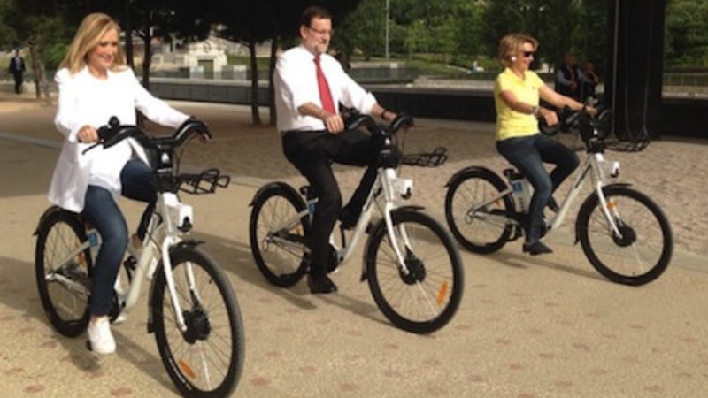 Det sker, selv om ingen af de tre politikere, kandidat til posten som regionsleder, Cristina Cifuentes, borgmesterkandidat Esperanza Aguirre eller selveste premierminister Mariano Rajoy til daglig sætter sig på cyklen.
