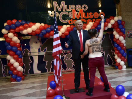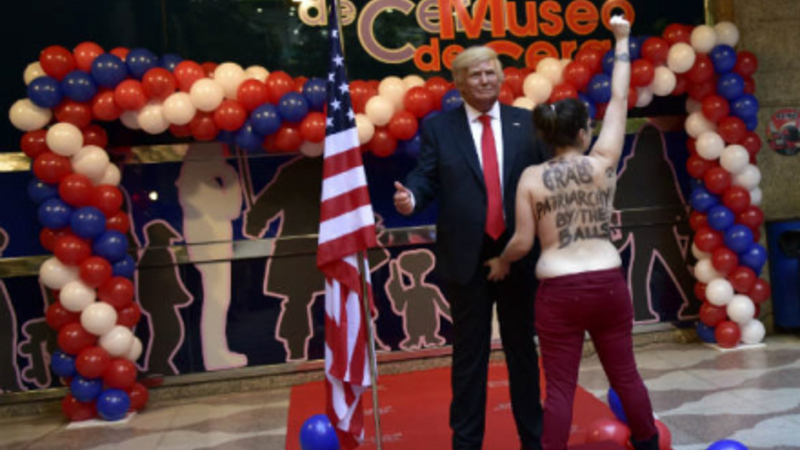 Una feminista irrumpe en la inauguración de la figura de Donald Trump en el Museo de Cera de Madrid al grito de "Grab them by the balls" pic.twitter.com/ra77Rujf6T