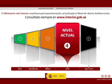 Terroralarmniveauet i Spanien er på niveau fire ud af fem, og det har det været siden den 26. juni 2016. Det er højt, men ikke det højeste.