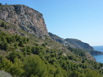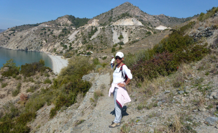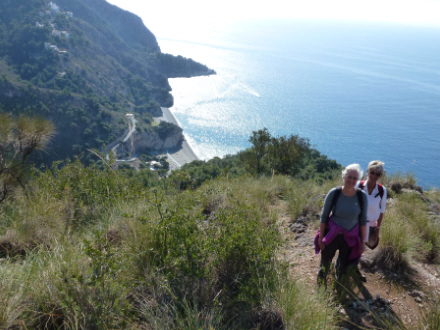 Nu går det opad for en stund. Det er en fint velanlagt sti og let at gå på. Inden længe er vi oppe, og nu er det tid til at beundre den helt enestående udsigt mod øst med Cantarriján-stranden og Cerro Gordo lige overfor.