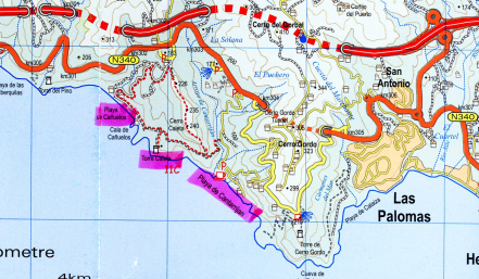 Vi starter ved nudiststranden Cantarriján, som man kommer til fra N-340 lige før - eller efter, hvis man kommer fra øst - tunellen ved Cerro Gordo.