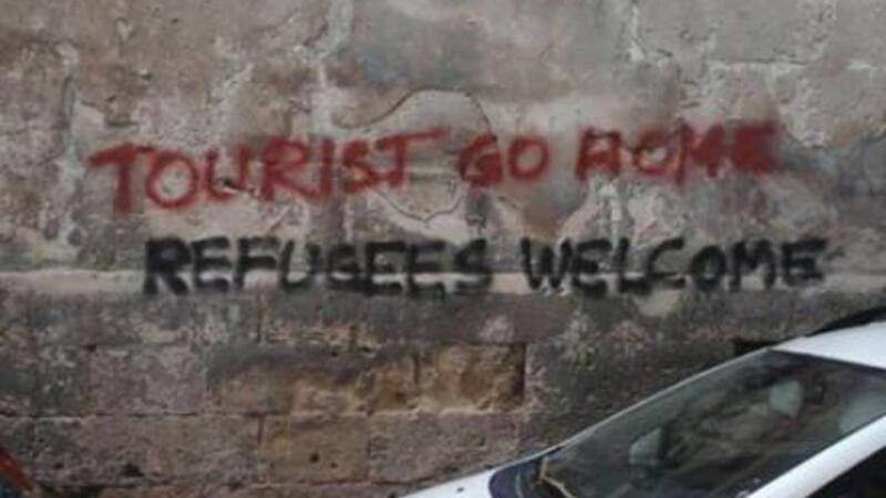 "Turister tag hjem. Flygtninge er velkommen" og ”turisme ødelægger vores by,” er bare nogle af de sloganer, der er blevet skrevet med grafiti omkring byens gotiske katedral for nyligt.