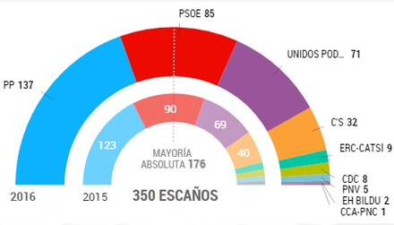Pablo Iglesias fra Unidos Podemos udtrykte sin skuffelse over partiets resultat. Pedro Sánchez fra PSOE bebrejdede Pablo Iglesias, at han ikke havde stemt for ham i den forrige samling, og Albert Rivera inviterede alle til samarbejde på den betingelse, at spørgsmålet om taburetter ikke var udgangspunktet.