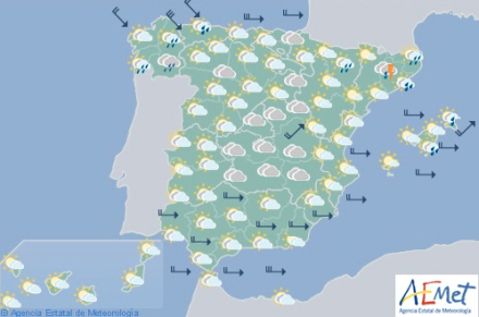 Overskyet himmel med regn på halvøen og Balearerne og byger i Strædet, Andalusiens østkyst, Catalonien og Balearerne. De to sidstnævnte får det som nævnt mest vådt og lokalt tung nedbør med torden, men det er hovedsageligt i løbet af dagens første halvdel. Herefter er der tale om mere spredte byger.