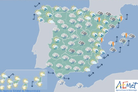Lokalt tung eller vedvarende i det vestlige Galicien, bjergene i de indre egne, Extremadura, Castilla-La Mancha, Navarra, Huesca og Lleida. Der forventes også meget nedbør og torden i Andalusien, Strædet , Pyrenæerne, det østlige Catalonien og Balearerne.