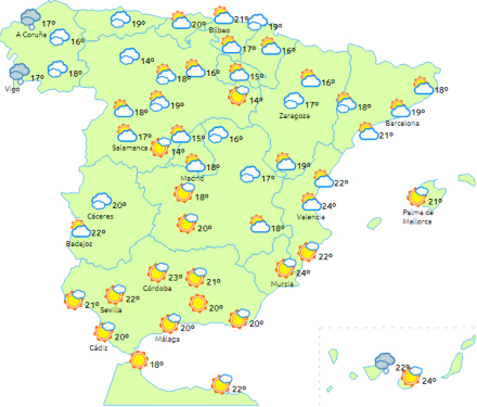 En atlanterhavsfront trækker ind over den nordvestlige del af halvøen. Det giver nedbør i Galicien, som lokalt kan være stærk eller vedholdende i vest - hovedsageligt fra middagstid.
