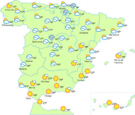 Det forventes, at en Atlanterhavsfront bevæger sig mod øst ind over den nordlige del af halvøen, og det giver nedbør i Galicien, Cantabrien og den nordlige del af Castilla y León, og i løbet af eftermiddagen når fronten også Pyrenæerne og det nordøstlige Catalonien.