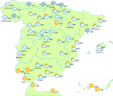I den nordlige del af fastlandet forventes tiltagende skydække fra vest til øst, når en front passerer, og det giver regn i Galicien, Cantabrien, det nordlige Navarra og Pyrenæerne, og det kan også dryppe lidt i omkringliggende områder.