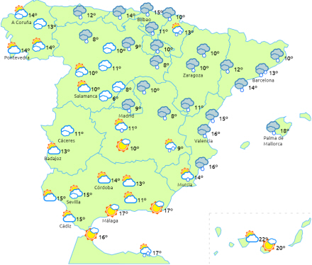 Skyet eller overskyet himmel på halvøen og Balearerne med udbredt nedbør, som er mest intens i den sydøstlige halvdel og svagere og mindre sandsynligt mod nordvest.