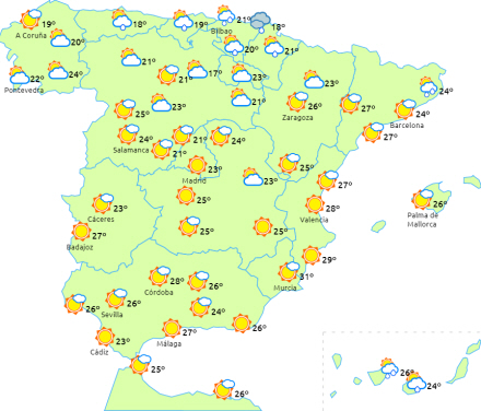 Stigende temperaturer - lokalt bemærkelsesværdige - over hele linjen på 29 til 34 grader og 17 til 22 i nat. Let vestenvind, som efterhånden frisker op til moderat, men den aftager igen i slutningen af dagen.
