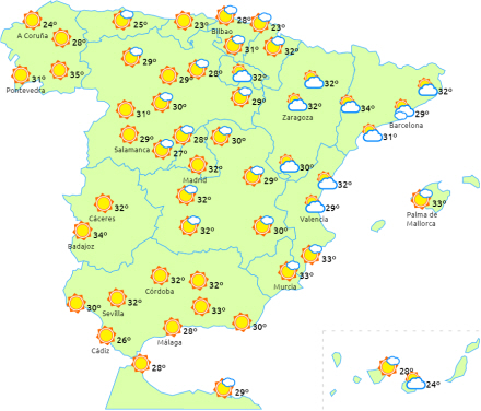 Byger og lokalt kraftigt tordenvejr i Extremadura, de cantabriske bjerge, De Iberiske Randbjerge og Pyrenæerne, mens der advares om høje temperaturer i Andalusien, Galicien og dalene Tagus, Guadiana, Ebro og Duero.