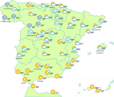 Der kommer perioder med højtliggende skyer i løbet af dagen til den nordlige og indre del af halvøen med mulighed for byger i Pyrenæerne og De Iberiske Randbjerge.