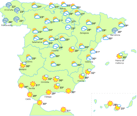 Skyet eller overskyet med tendens til opklaring i slutningen af dagen over den nordlige tredjedel af halvøen med regn i Galicien og Pyrenæerne, der kan brede sig til den vestlige ende af nordvestkysten og det nordvestlige Castilla y León.