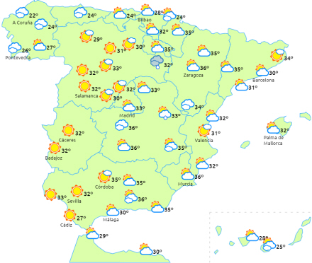 I nordvest er det overskyet med sandsynlighed for svag regn ved kysten. Overvejende letskyet på resten af halvøen afbrudt af perioder med højtliggende skyer. I løbet af dagen kommer der flere skyer i store dele af det nordlige og central-østlige af halvøen med sandsynlighed for regn- og tordenbyger, der lokalt kan være ret kraftige i den østlige ende af nordvest, den øvre Ebro-dal, De Iberiske Randbjerge og Pyrenæerne.