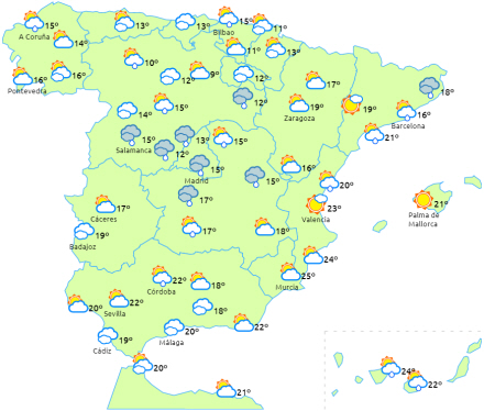 Overskyet himmel over store dele af halvøen med regn, byger og lejlighedsvise tordenbyger ved nordvestkysten, de indre egne og den nordøstlige del. Nedbøren vil være mere intens og hyppig i det nordlige Aragon og Catalonien og om eftermiddagen i den østlige del af Castilla y León og De Iberiske Randbjerge - lokal tung nedbør i alle disse områder.