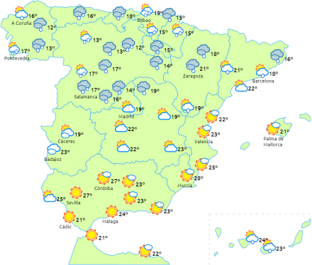 Letskyet eller klart på den sydøstlige del af halvøen, De Baleariske Øer og de sydlige dele af De Kanariske Øer.