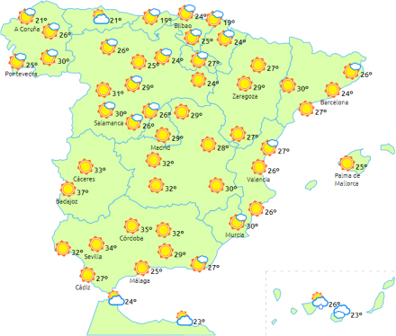 Maksimumtemperaturerne er i generel stigning, så vi kommer over 35 grader i Guadalquivir, Guadiana og Tagus. Minimumtemperaturerne falder på den nordøstlige del af halvøen med noget pletvis frost i Pyrenæerne.