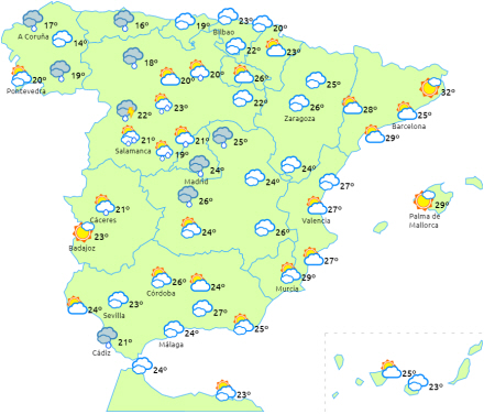 På den østlige tredjedel af halvøen og De Baleariske Øer er det overskyet i perioder, men det skulle holde tørt. På resten af halvøen overskyet himmel med regn- og tordenbyger.
