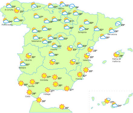 Dagstemperaturerne vil stige i den østlige tredjedel af halvøen og på den nordlige højslette og i det centrale del af De Kanariske Øer. Nattemperaturerne vil stige på den nordlige halvdel af halvøens indre egne. Temperaturerne overstiger 34 grader i den sydlige indre del af halvøen og i Ebro-dalen, lokalt 36 grader i Guadalquivir.