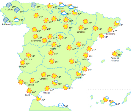 Advarsler om meget høje temperaturer til den sydøstlige tredjedel af halvøen, de nordøstlige indre egne og Balearerne.