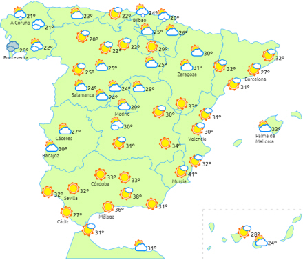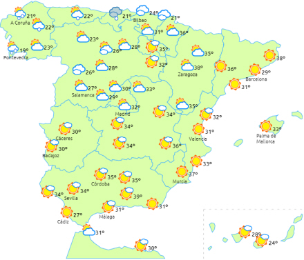 Temperaturerne vil overstige 36 til 38 grader i den østlige halvdel af Den Iberiske Halvø, Guadalquivir-dalen og Balearerne, mens de når op på 40 til 42 grader i Ebro-dalen, det sydlige Valencia og andre dele af den helt sydøstlige del af Den Iberiske Halvø.