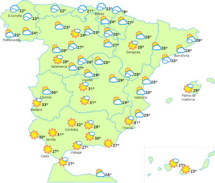 Stigende maksimumtemperaturer i det meste af landet, men det eneste sted, vi når over 35 grader, er dog i Guadalquivir-dalen. Minimumstemperaturer med små ændringer, bortset fra lette fald i Galicien og lette stigninger i resten af den nordlige halvdel af fastlandet.