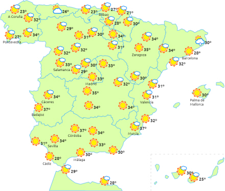 I de fleste dele af landet forventes tørt og solrigt vejr med letskyet eller klar himmel i dagens første halvdel, dog med lavtliggende skyer om morgenen på kysten og i dele af Galicien, det vestlige Asturien, langs Alboran-kysten og de nordlige egne af De Kanariske Øer.