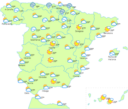 Perioder med lavtliggende skyer og tåge til det meste af de nordlige, indre egne og i Galicien, og letskyet med perioder med højtliggende skylag over resten af halvøen og på Balearerne.