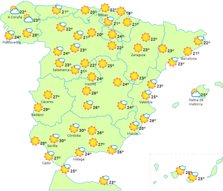 Dagstemperaturerne vil stige på den nordlige halvdel af halvøen og De Kanariske Øer, mens der kun vil ske små ændringer i resten af landet. Dagstemperaturerne kan stadig overstige 30 til 32 grader i den nedre del af Guadalquivir.