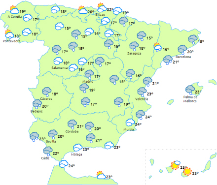Lokalt kraftig eller vedvarende nedbør i Galicien, halvøens indre egne, Extremadura og dele af Andalusien. Der advares også om kraftig vind langs Galiciens kyster.