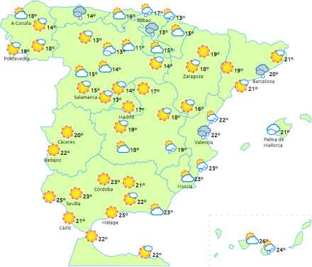 Regnbyger og lokalt kraftige tordenbyger i den sydlige del af Valencia, Murcia og på Ibiza. Perioder med kraftig vind i Ebro-dalen, Ampurdán, de sydøstlige kyster på halvøen og på Balearerne.