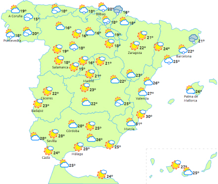 Skyet til overskyet med nedbør i Galicien, som lokalt kan være kraftig og ledsaget af tordenbyger i vest tidligt om morgenen. I løbet af dagen vil nedbøren brede sig i svagere form nordvestkysten og de vestlige Pyrenæer.