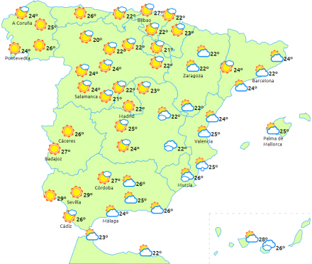 I resten af landet letskyet med enkelte højtliggende skyer, men med ankomsten af en Atlanterhavsfront i løbet af dagen bliver det mere overskyet i Galicien med mulighed for nedbør i slutningen af dagen.