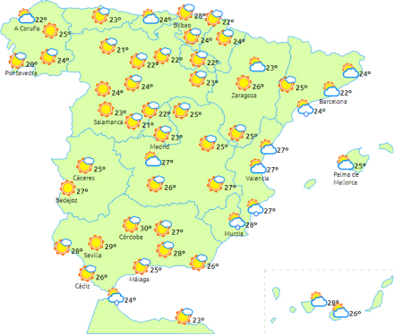 Dagstemperaturerne vil generelt stige undtagen i Gibraltarstrædet, hvor de vil falde. Dagstemperaturerne kan overstige 30 til 32 grader på De Kanariske Øer og i den nedre del af Guadalquivir-dalen. Nattemperaturerne stiger i den vestlige halvdel af halvøen.