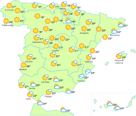 Temperaturer med små ændringer på 21 til 25 grader. Svag vind fra nord til nordøst, som er kraftigere på de sydøstlige og vestlige kanter, hvor kraftig vind ikke er udelukket i de centrale timer af dagen. Overvejende briser på sydvest- og nordkysten.