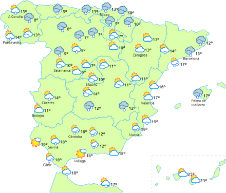 Der advares også om kraftig blæst ved Galiciens kyst, nordvestkysten, Ampurdán, Strædet og Alborán. Markant lavere temperaturer til den nordlige halvdel af halvøen.