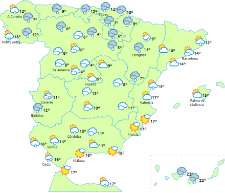 I den nordlige del af Galicien, nordvestkysten og Pyrenæerne er det skyet eller overskyet med kraftig nedbør, som lokalt kan være vedvarende i Baskerlandet. Overvejende overskyet over resten af landet med lejlighedsvis regn og byger i Catalonien, på Balearerne og Melilla samt i resten af Galicien og i området omkring de iberiske og centrale bjerge samt de sydøstlige bjerge, som dog generelt vil aftage efterhånden.