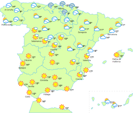 Dagstemperaturerne falder på næsten hele halvøen og Balearerne. Nattemperaturerne falder på det meste af den nordlige og østlige del af halvøen, selv om der i dale og på heder kan forekomme mindre stigninger. Også lette stigninger i den sydvestlige del, den helt sydøstlige del og i Gibraltarstrædet. Frost i bjergene på halvøen - noget kraftigere i Pyrenæerne.