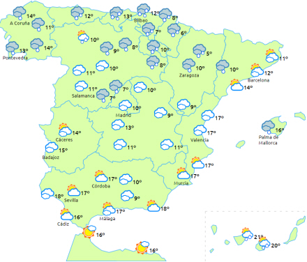 Dagstemperaturerne stiger på den nordlige, centrale og vestlige del af halvøen, mens de falder på den østlige tredjedel og begge øgrupper. Frost i bjergområderne på den nordlige halvdel og i den sydøstlige del af landet samt i de omkringliggende områder - koldest i Pyrenæerne.