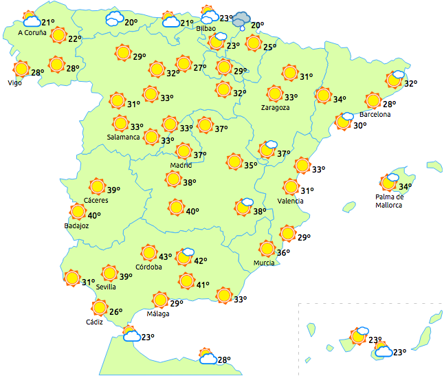 Man forventer over 35 grader i store dele af de indre egne i den sydlige halvdel af fastlandet samt af og til i de indre egne i hele fastlandet, Castilla y León og Ebro-dalen.