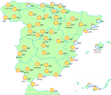 Temperaturer med få ændringer, så niveauet er fortsat højere end normalt for årstiden. Vi kommer sandsynligvis over 30 grader i Guadalquivir, Guadiana og Tajo-dalen.