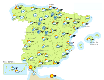 Vejret i Spanien, tirsdag klokken 14:00