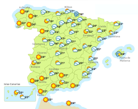 Vejret i Spanien, mandag klokken 14:00