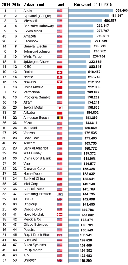 Rankingen er udarbejdet med basis i Bloombergs opgørelse af virksomhedernes børsværdi ved lukketid den 31. december 2015.